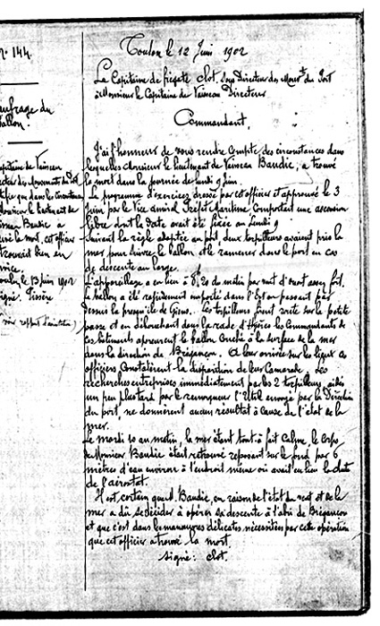 Circonstances du décès Bien avant la création de l’aviation maritime, un centre d’aérostation navale avait été créé à Toulon en 1888-1890. Etabli dans le hangar numéro 4 du parc aux bois de Lagoubran qui avait été modifié pour recevoir ses installations spécialisées, il se situait à l’extrémité ouest de l’arsenal. Dépendant de la Direction des mouvements du port de Toulon, il avait à sa tête un officier de Marine, assisté d’une douzaine de vétérans ayant suivi un stage à l’école aérostatique de Chalais-Meudon. Cet officier, en plus de ses fonctions à la direction des mouvements du port, était chargé du service d’aérostation de la Marine. Il était également chargé de l’information et de l’instruction des officiers et marins de l’escadre sur la manœuvre des ballons |